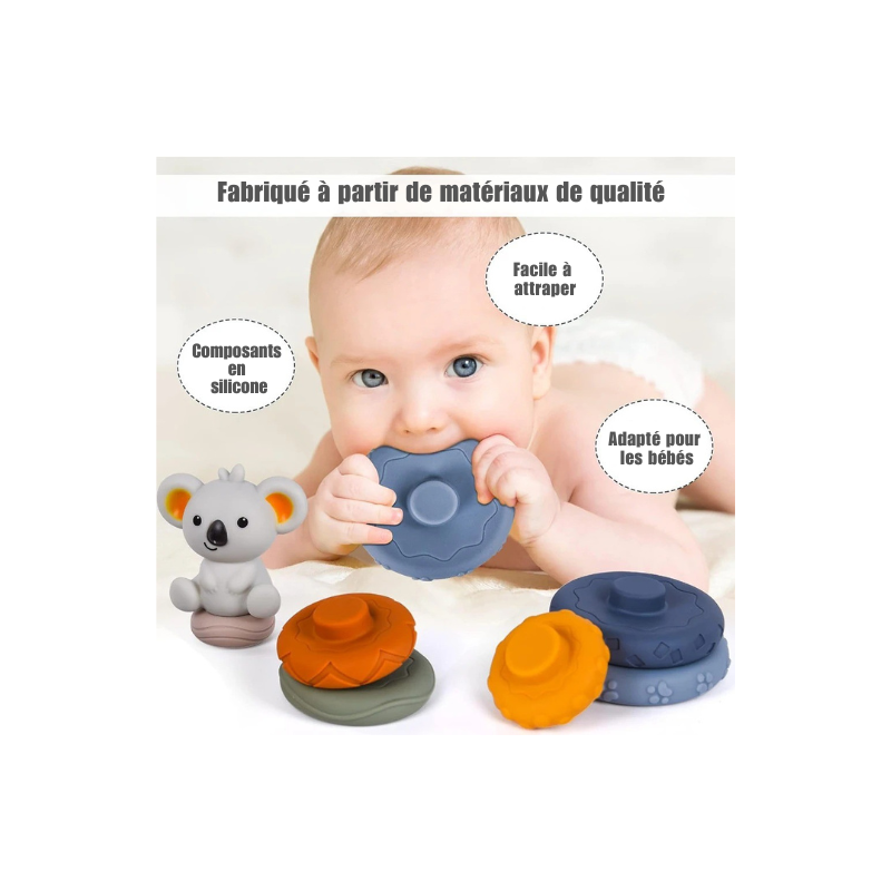 Doté de formes en relief, d’anneaux souples à mâchouiller (idéaux pour les poussées dentaires), et de couleurs douces, ce jeu stimule la motricité fine, la coordination œil-main, la créativité et le développement visuel. Fabriqué en silicone, il est aussi sûr que ludique. Le petit koala au sommet ajoute une touche d’affection irrésistible. Léger, facile à manipuler et à nettoyer, ce jouet est un incontournable pour accompagner bébé dans ses premiers pas vers l’autonomie.